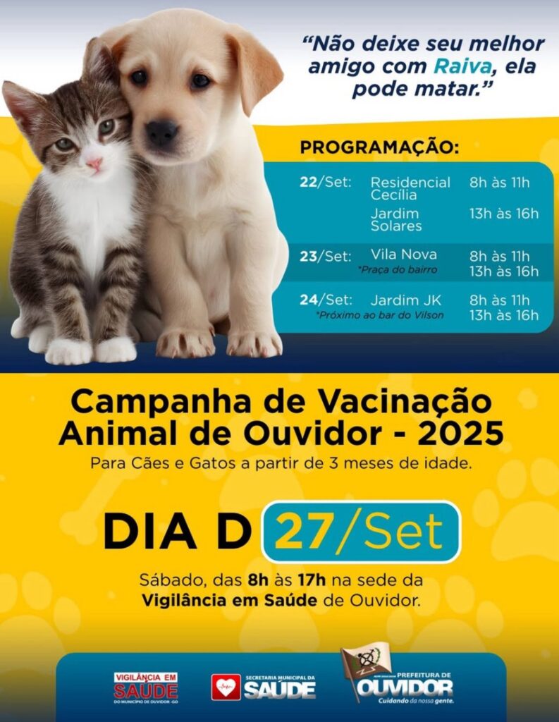 A Prefeitura de Ouvidor, por meio da Secretaria de Saúde, convida toda a população a participar da Campanha de Vacinação contra a Raiva em cães e gatos. Proteja quem você ama e ajude a manter nossa cidade livre da doença!
