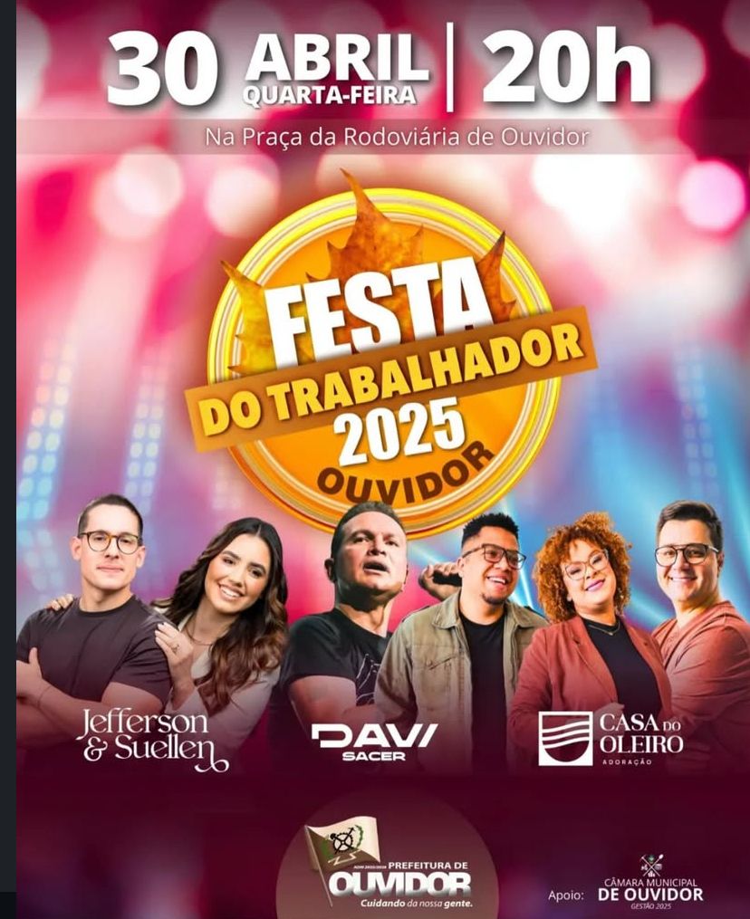 Grandes Shows com Jefferson & Suellen , Davi Sacer e Casa do Oleiro Adoração, inicia a programação da comemoração da festa do trabalhador 2025 de Ouvidor.