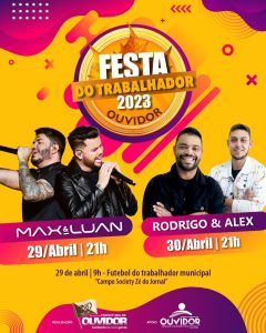 #OUVIDOR | FESTA DO TRABALHADOR. O resultado de um bom trabalho é a alegria de um povo. Ouvidor tem um povo ordeiro, receptivo, amigo e acima de tudo trabalhador, por isso a prefeitura municipal de Ouvidor convida toda população para celebrarmos juntos. Sorteio de vários brindes e shows, dia 29 Max e Luan dia 30 Rodrigo e Alex. Dia 29 campeonato futebol trabalhador municipal, a partir das 09hs arena Zé do Jornal. Fonte: Secom Ouvidor Web Rádio e Blog Interativa 100% Ouvidorense